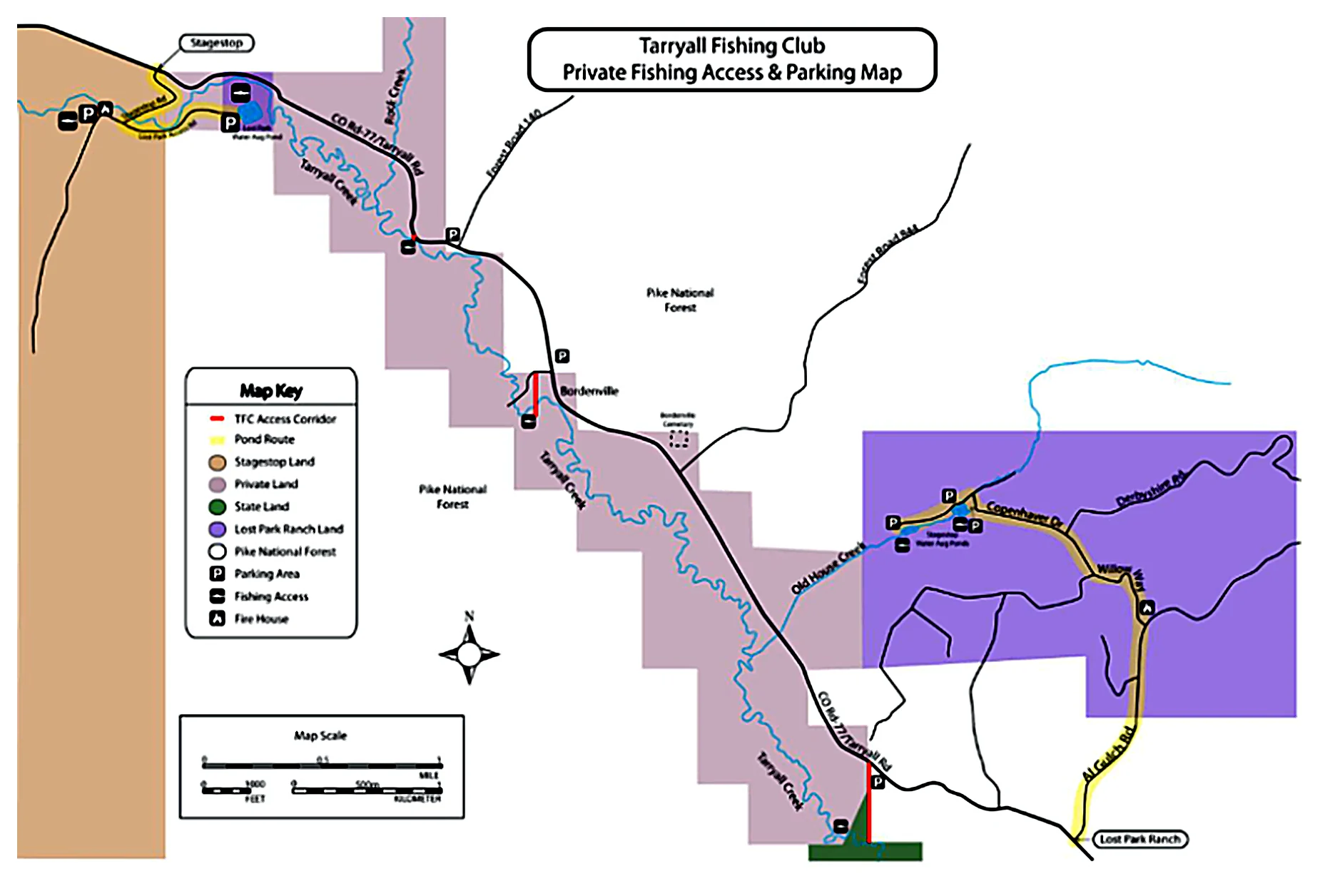 The maps below identify approved fishing access routes, parking areas, and access points available to Tarryall Fishing Club members. Members and guests must use only designated access points and comply with all posted signage and rules.